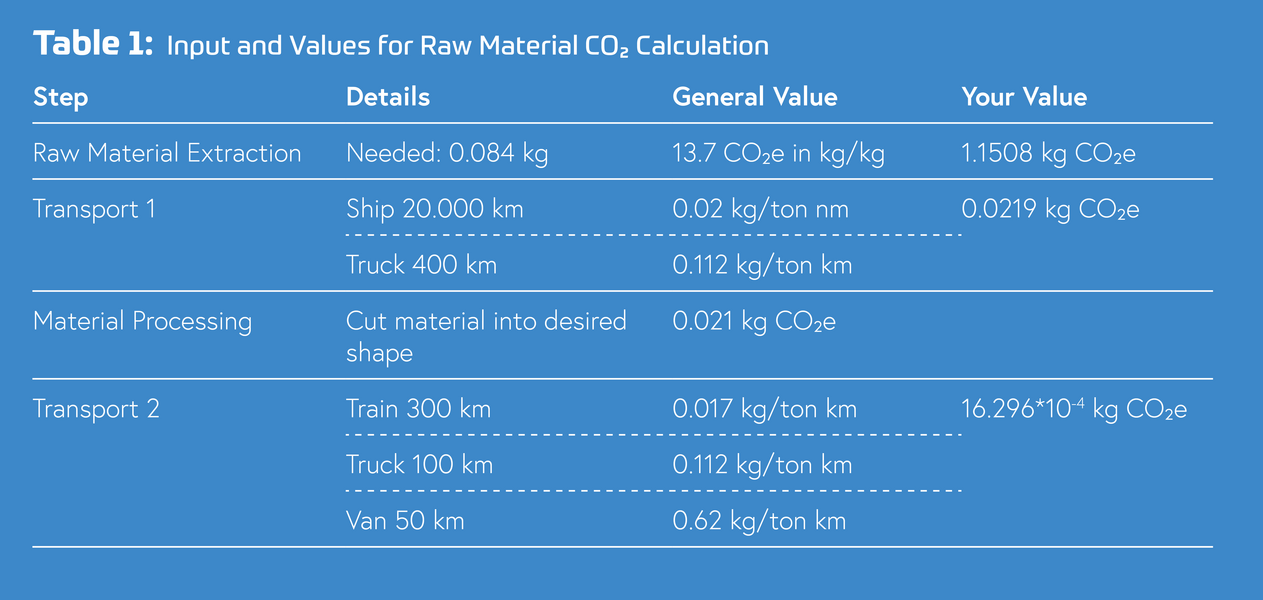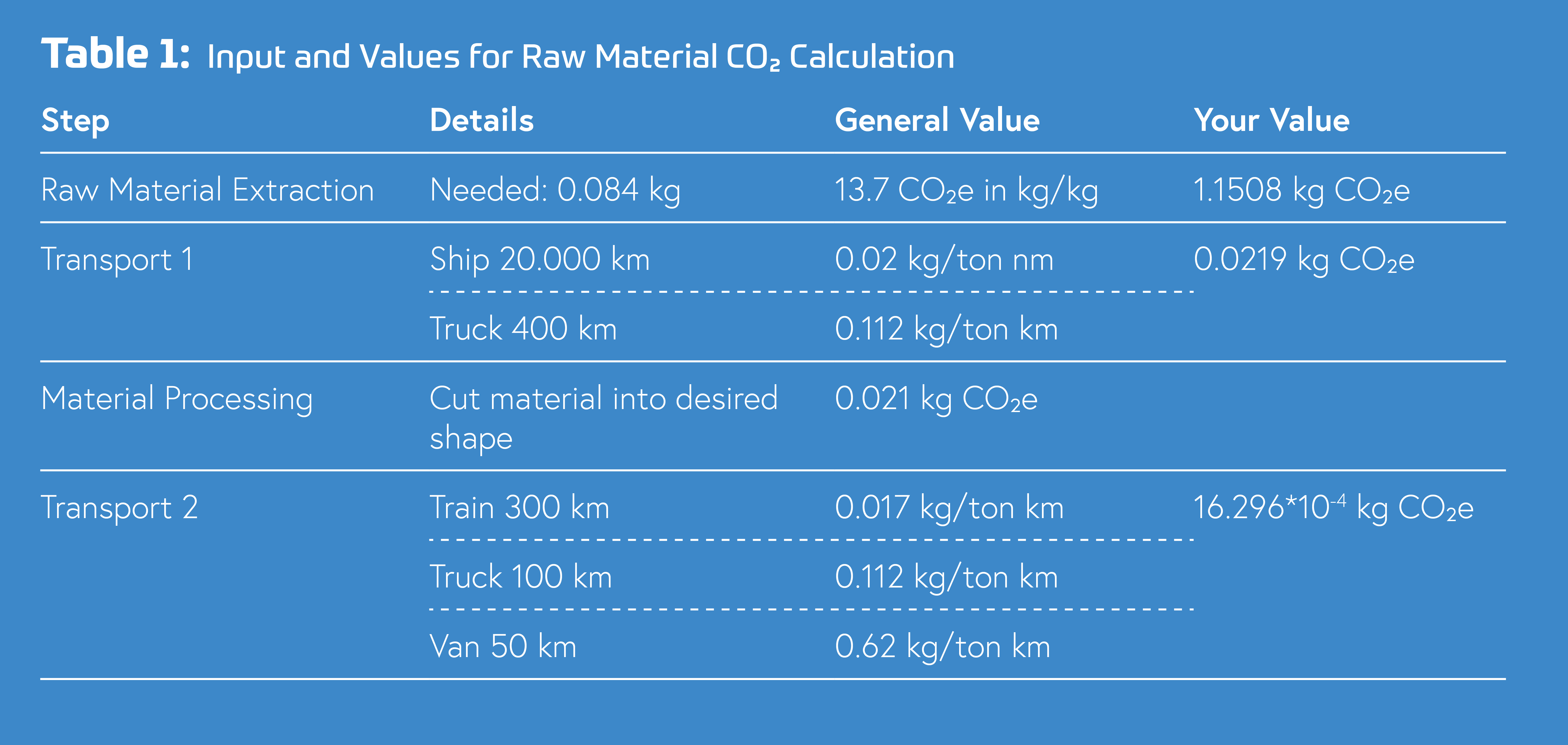 The first step is to account for raw material extraction, using aluminum as an example. This includes not only the production of the material itself but also its transportation. The calculation should consider the origin of the raw material, how it is extracted and prepared, and the various modes of transport involved, such as shipping and trucking, from the extraction site to a reseller and then from the reseller to your workshop, which might involve trains, trucks, or vans (see Table 1).