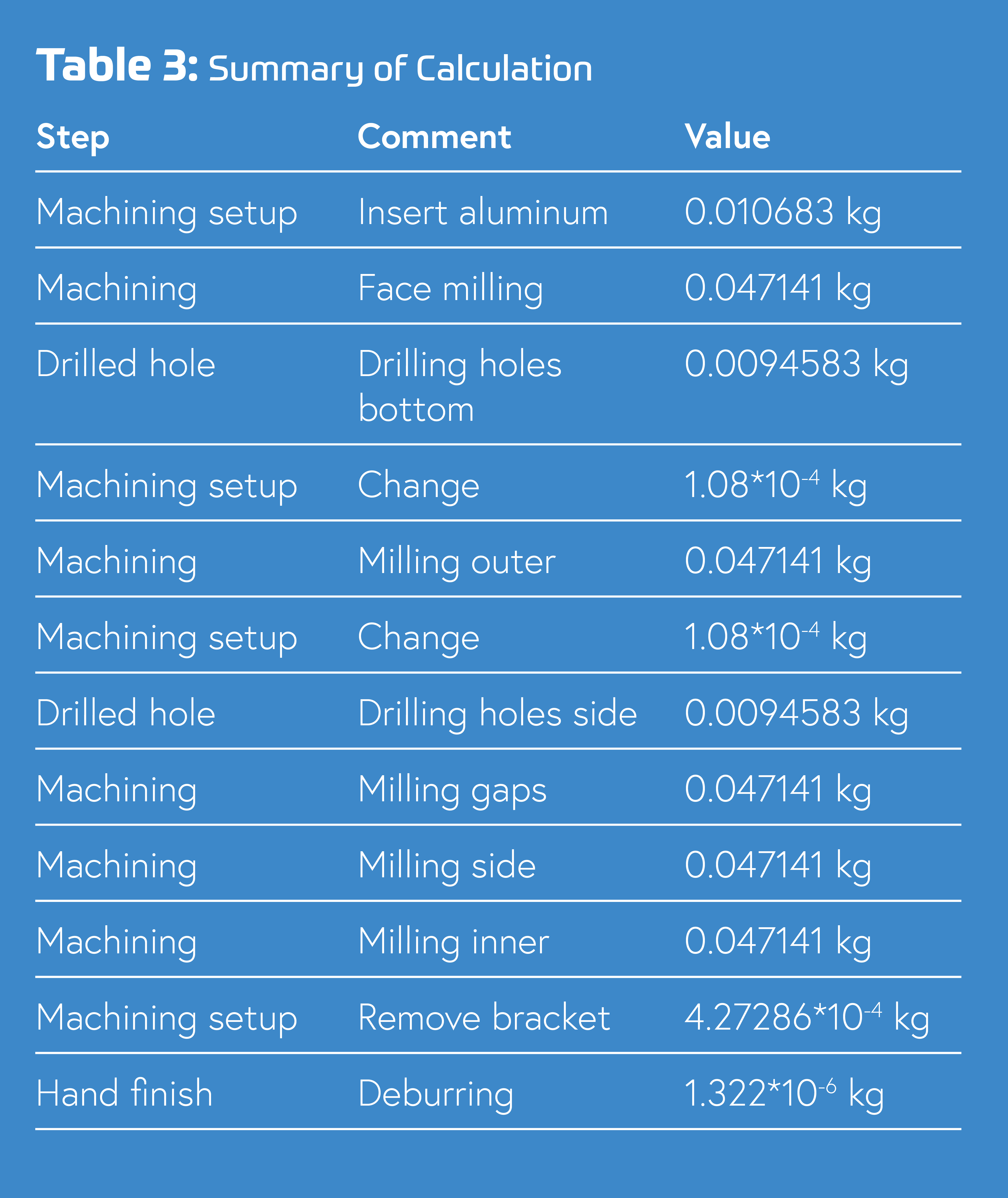 Once the raw material arrives at the workshop, the second step focuses on the manufacturing of parts. This involves calculating the emissions associated with setting up and operating machinery, such as milling machines. Each phase – initial setup, setup changes, and part removal – should be considered, along with the actual machining operations like milling or drilling. For each step, it is necessary to detail the time required, the resources consumed, and any additional factors, such as the use of coolants. The energy consumption for each machine state must be identified, along with the local energy mix and the CO₂ value of additional materials like coolants (see Table 2). The CO₂e for energy consumption is calculated using the formula:
