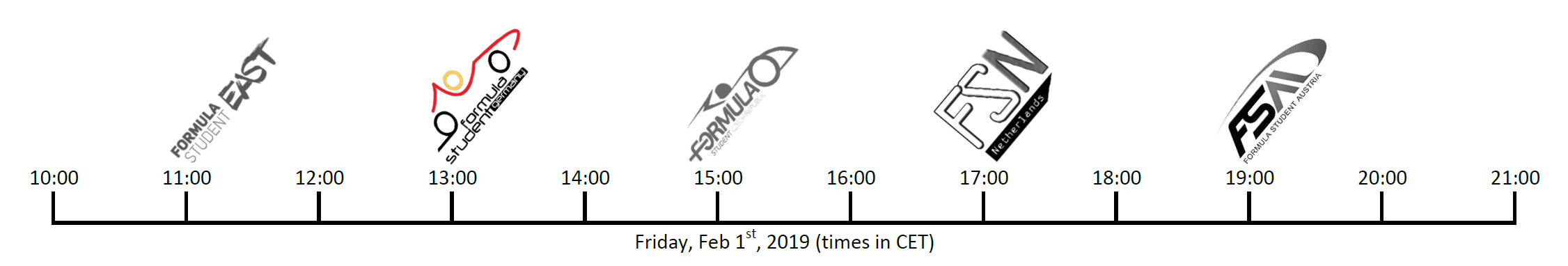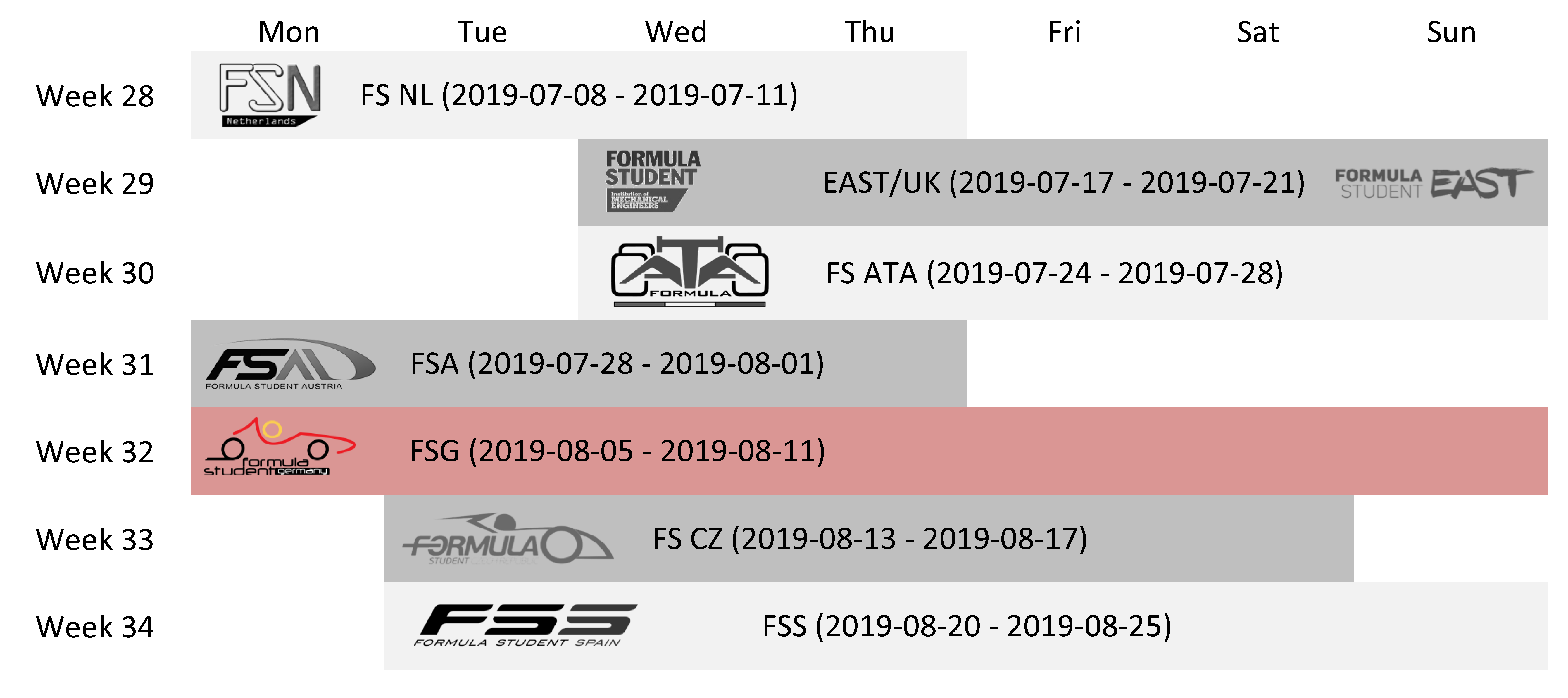 The FSG Registration Quiz will be held on 2019-02-01 13:00 CET. FSG 2019 will be held from 2019-08-05 until 2019-08-11 in Hockenheim. Both of these days have been chosen in coordination with the other European Formula Student Events.