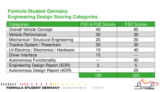 Based on FS Rule S3.8.2, Formula Student Germany will use different Engineering Design Scoring Categories during #FSG18. We have modified the scoring matrix to match it to the established Engineering Design Event Procedure and make the scoring more transparent for teams as well as judges. You will find the categories and points in the attached document.