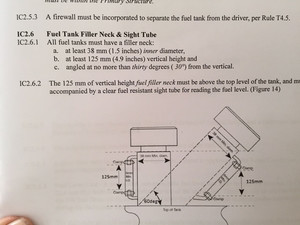 For that reason from now on the handling of the rule at FSG scrutineering will follow this principle: Inner diameter of the filler neck has to be equal or larger than 38 mm (as written and shown in rule/drawing). The filling cap diameter can be smaller (as long as large enough to fill fuel safely). It is the responsibility of the teams though to proof the 38mm diameter of the inside of the filler neck (behind cap). (Please see snapshot of rule).