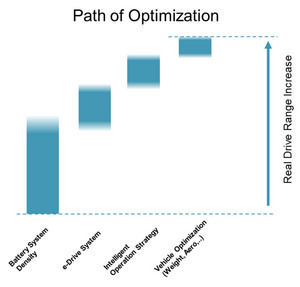 In addition, the vehicle needs to be optimized as a complete system to take full advantage of all that these e-drive solutions can provide. This includes a predictive operation strategy, which enables the vehicle to predict changes in terrain and traffic situations, leveraging the power of Car2X and artificial intelligence to derive an economical operating strategy. In addition, the battery represents a major opportunity. Battery system energy can be significantly increased by decreasing cobalt content, adding improved electrolytes, and further developing the battery management system. Other areas of optimization on a vehicle level include low-friction wheels, lightweight vehicle structure, reduced air resistance cooling systems, and a predictive operating strategy.