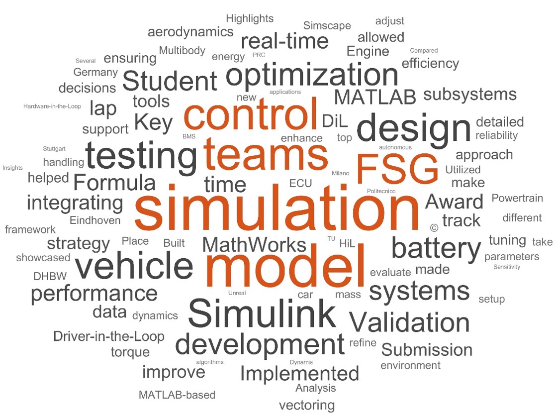 At MathWorks, we have the privilege of seeing some of the most innovative student teams in the world push the boundaries of model-based design using MATLAB and Simulink. The FSG MathWorks Modeling & Simulation Award was introduced for the first time in 2024, and we were glad to receive 13 impressive submissions from teams showcasing their advanced simulation and modeling techniques. This award designed to recognize and reward teams that excel in utilizing MathWorks tools for the design of their electric and autonomous vehicles in the Formula Student Germany competition.