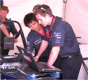 Technically, the Auckland car was the more interesting, In order to effectively run a narrow track and reduce the yaw inertia as the car negotiates the slalom sectors of the circuit, the team re-engineered the power train to lower the c/g. They designed a transaxle system to replace the more normal chain drive arrangement (as used by the RMIT car). On track, especially in the wet, the Auckland car looked brilliant, but in the final washout, the Design Judges could not justify the additional 40kg weight penalty, so the RMIT car was awarded second place in Design, just a few points ahead of the Kiwi car.