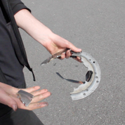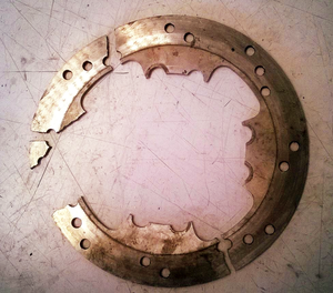 During the various testing phases these washers were in place however when the car was stripped and rebuilt for competition we had forgotten to put them back on. This lack of space on one side ate up the disk`s floating ability and under the repeated strain of locking the wheels of a slightly heavier car the lack of floating space caused the cast iron disks to go into bending. Massive failure was absolutely guaranteed.