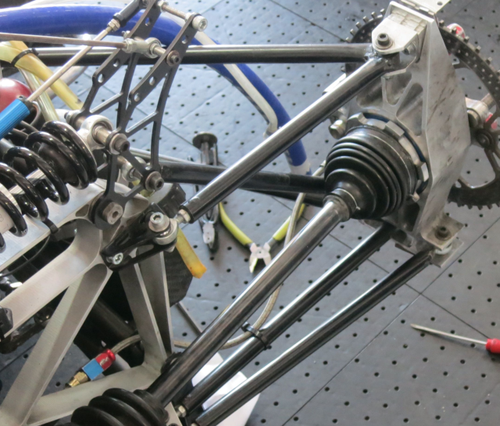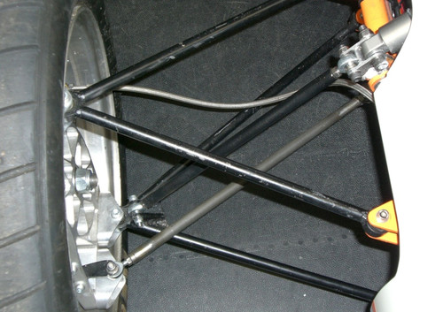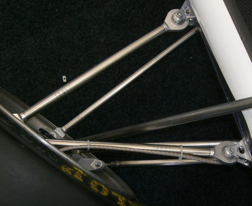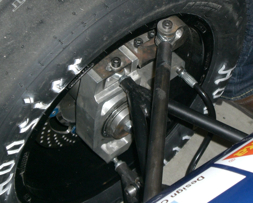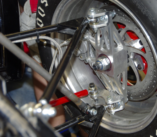 Teams justify their use of rod ends by citing ease of adjustment. That is a ‘cop out’! There are smarter, stiffer and just plain better ways to adjust such parameters as Camber and Caster. In the example illustrated above for instance, shimming between the lower clevis and the upright would permit Camber adjustment without disturbing the Toe setting!