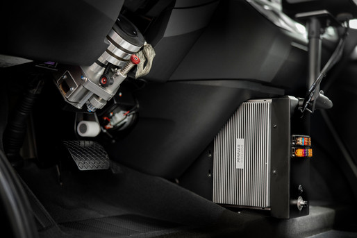 The system has been approved for road use in accordance with ECE-R13 (braking) and ECE-R79 (steering). The processor unit (ECU) fulfills the highest requirements in accordance with the ISO 26262 ASIL D functional safety standards. Today, it already allows for use in a real test environment, thus giving rise to well-founded conclusions about the technology being tested. The safety concept is based on triple redundancy. Three processors handle digital (CAN/FlexRay/LIN) or analog input signals (joystick/steering wheel) in real time and control redundant servo motors in accordance with a logical validity check based on the two-out-of-three majority principle to operate the gas and brake pedals or the steering.
