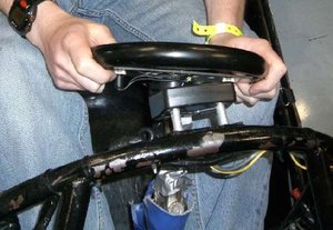 Steering system lateral (radial) forces are relatively small when the car is on the track, running at speed. However, that does not relieve you of the responsibility to mount your steering wheel & column in a workmanship like fashion. Any steering wheel / column should be able to withstand at least a 660 N (150 lb.) lateral (radial) force without failing.