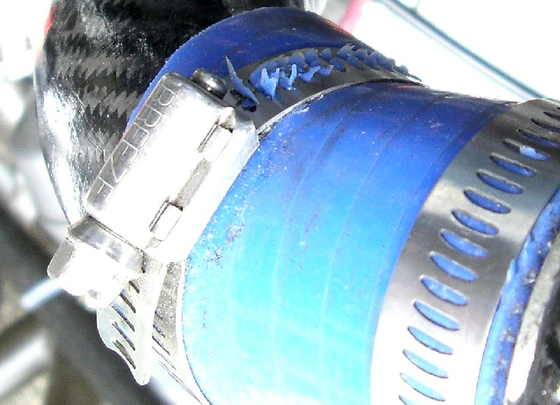 In another column, I warned about the dangers of using ‘hardware store quality’ components. This team demonstrated the reason why you should use quality hose clamps, suitable for the application. See how the slotted band has damaged the hose.