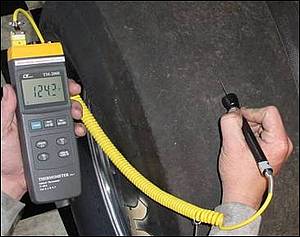 This shows a standard digital thermometer with a needle type probe being used to measure tyre core temperature. There is no need to buy a special memory type tyre pyrometer for this task.
