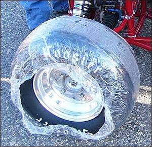 Teams use a variety of wraps to keep their tyres clean. Beware of using ‘shrink wrap’ polyethylene film on hot tyres. This film may bond with the hot tread rubber making it impossible to remove in places.