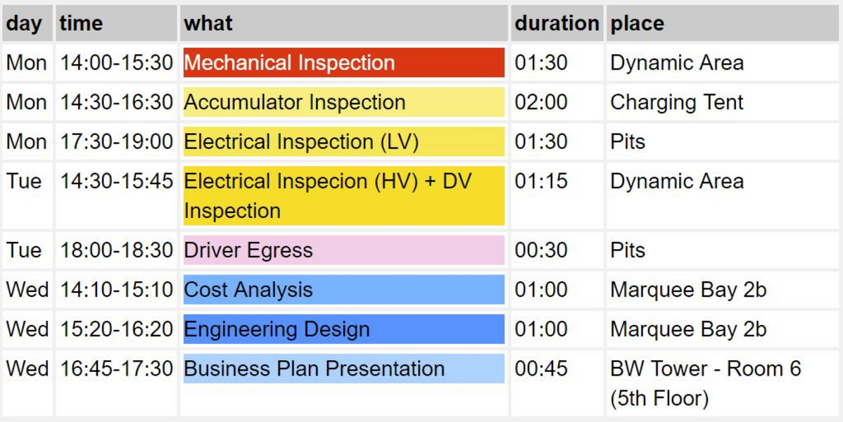 The slots are planned according to the registration quiz results keeping in mind possible collisions with static events. If the team does not show up at their slot or is not able to finish the inspection on time it will have to use a re-inspection slot to be able to pass technical inspection, which will be handled according to the first come first served principle. This will ensure that all teams have the possibility to pass technical inspection before the dynamic events start and ensures a fair treatment of all the teams.