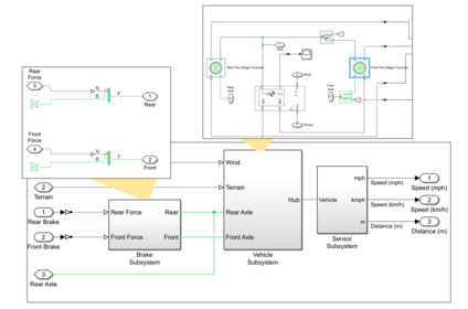 - Vehicle: To model a two-axle vehicle body in longitudinal motion we have used the Vehicle Body↗ block in conjunction with a set of Tire blocks.